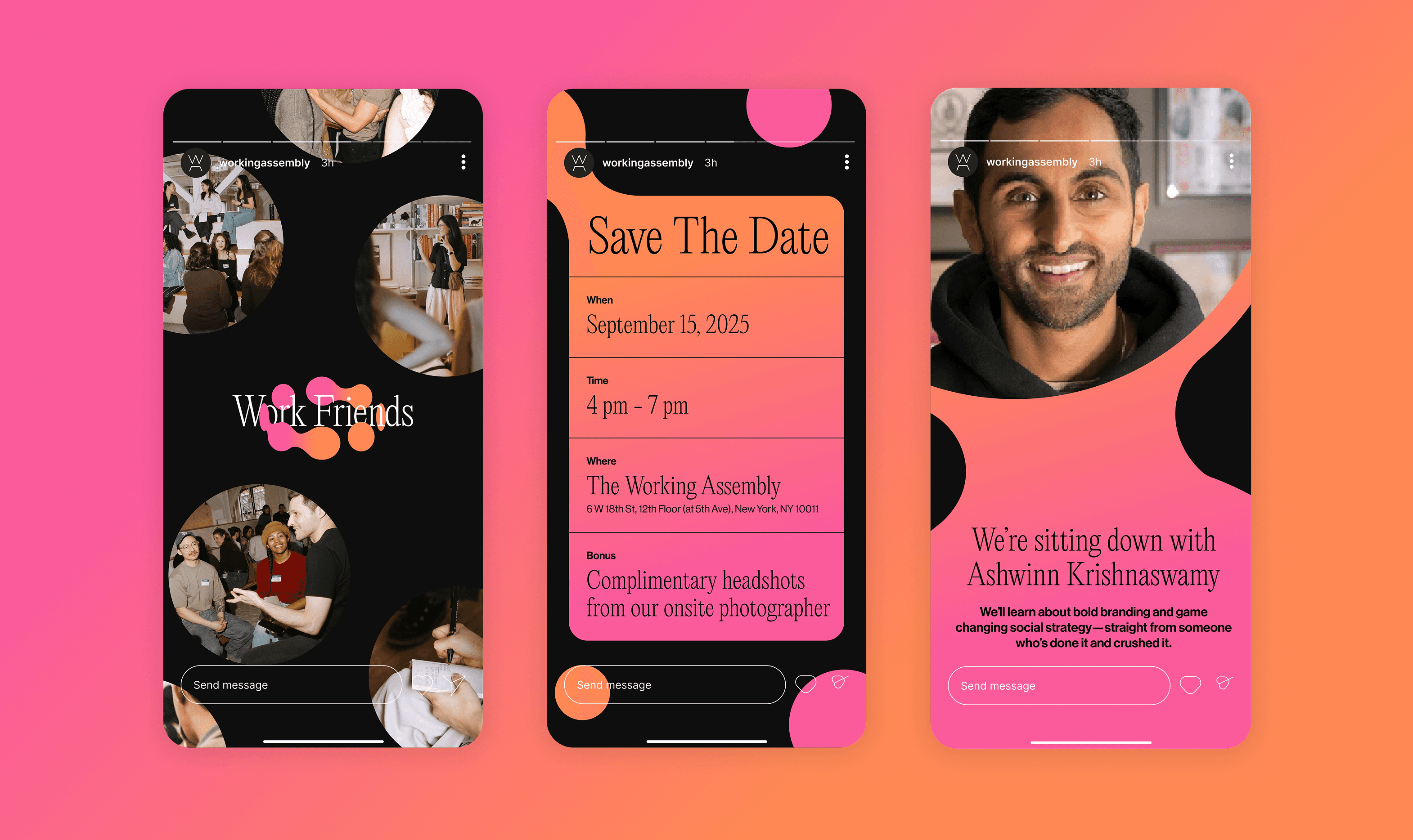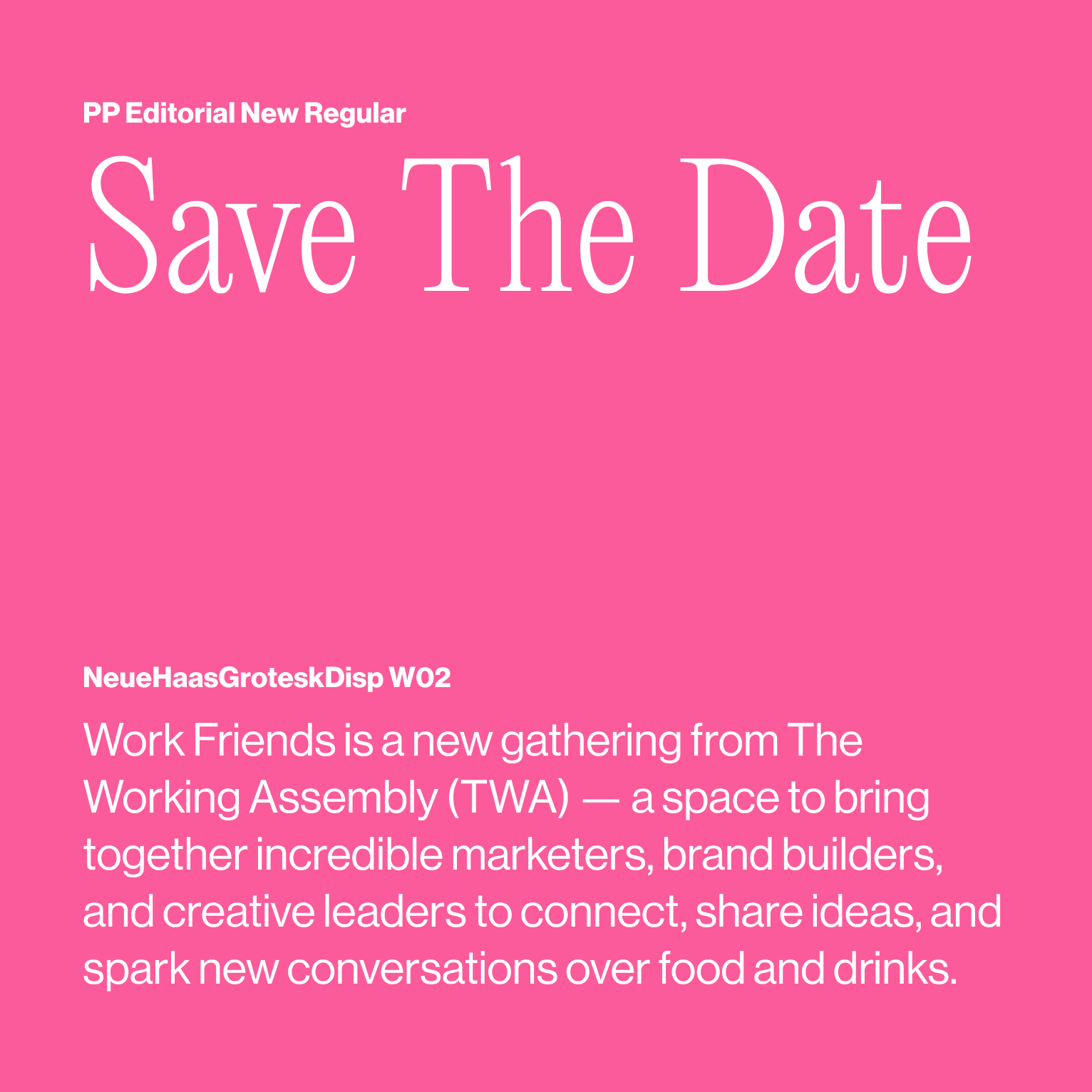 Work Friends is a new gathering series from The Working Assembly that brings together marketers, brand builders and creative leaders to connect, exchange ideas and spark conversation over food and drinks. I designed the visual identity, website, motion graphics, email newsletter and other visual application, creating a presence that feels welcoming and supports community building.